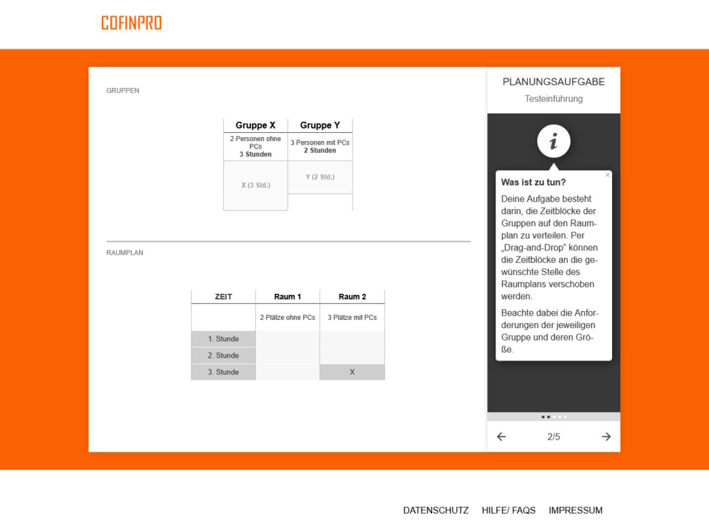 Zwischen den einzelnen Testverfahren erfahren die Testpersonen Wissenswertes zum Unternehmen und erhalten interessante Einblicke in die Unternehmenskultur der Cofinpro.