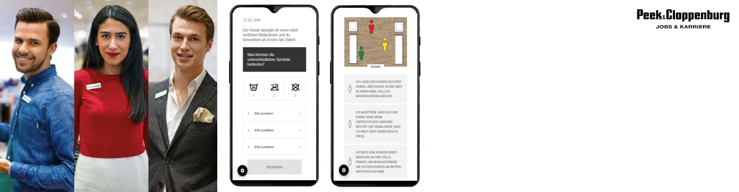 So unterschiedlich die beiden Berufsbilder sind, so haben sie doch eine Gemeinsamkeit: den Kundenfokus. Beim Durchlaufen der Checks wird schnell klar, dass Peek & Cloppenburg besonderen Wert auf den richtigen Umgang mit Kunden legt. Ein freundliches und höfliches Auftreten ist dabei ebenso wichtig wie eine kompetente Beratung.