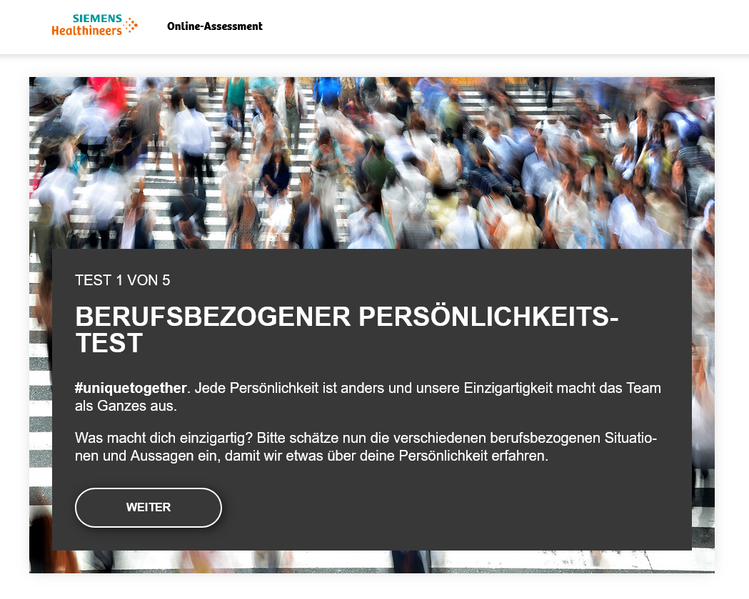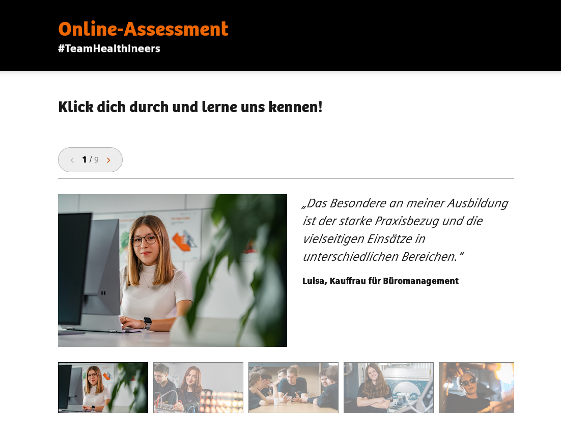 Das interaktive Assessment bietet Bewerbenden die Möglichkeit, ihre Fähigkeiten und Stärken zu zeigen und den ersten Schritt in Richtung einer erfolgreichen Karriere bei Siemens Healthineers zu gehen.